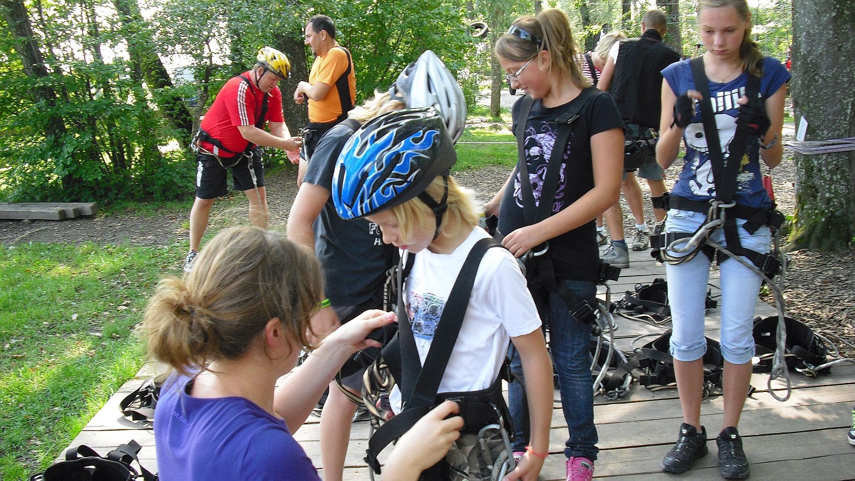 Da es sehr heiß war, war der Park gut besucht. Trotzdem mussten wir uns nicht lange anstellen. Die jüngste von uns, die Emily, machte den Kinderparcours. Alle anderen trauten sich an den roten (mittleren) Parcours. Außer Anetta die als Fotograf das Geschehen von unten für die Nachwelt dokumentieren mußte...