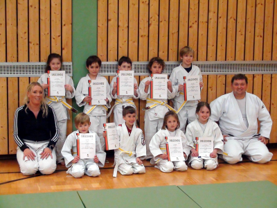 Der unerwartet große Andrang in der im letzten Jahr gegründeten "Bambini"-Gruppe zwang uns bereits nach den Herbstferien die ersten Kinder in die nächsthöhere Kategorie der "Judo Anfänger"