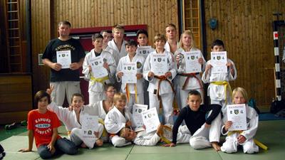 Stolze Träger des 8. Kyu (weiß-gelb Gürtel) sind ab sofort: Niederhauser Magdalena, Huber Miriam, Sebastian Steffl, Lukas Beilhack, Alexander Frank, Schinkel Jonas, Schremsdörfer Donata, Meder Markus und Art David. Von Seiten der Trainerschaft ein riesen "Glückwunsch".
